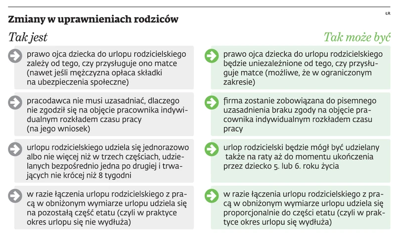 Największe szanse na uchwalenie będą miały zmiany zwiększające uprawnienia ojców do płatnej opieki nad dzieckiem. Takie rozwiązanie wspiera bowiem zarówno rząd, prezydent, jak i partnerzy społeczni. Najmniej prawdopodobne wydaje się natomiast przyjęcie rozwiązania, zgodnie z którym urlop rodzicielski będzie można wykorzystywać w częściach – aż do ukończenia przez dziecko 5. lub 6. roku życia. Budzi ono ostry sprzeciw pracodawców, wywołuje wątpliwości związkowców oraz jest sprzeczne z modelem płatnej opieki nad dzieckiem wdrożonym przez rząd.