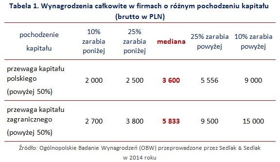 Mediana wynagrodzeń zarówno w firmach z przewagą kapitału zagranicznego, jak i z kapitałem polskim była znacząco niższa niż średnia.