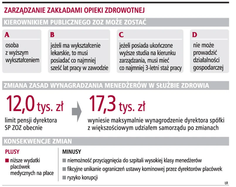 Dopływ menedżerów do systemu ochrony zdrowia jest ograniczony, bo w placówkach medycznych działa tzw. ustawa kominowa. Obecnie dyrektorzy publicznych szpitali nie mogą zarobić więcej niż 12 tys. zł. Co więcej, nawet zmiana formy prawnej ZOZ nie zniesie tego ograniczenia, lecz jedynie nieznacznie je obniży. Ustawa kominowa obejmie bowiem wynagrodzenie dyrektorów tych placówek medycznych, które staną się spółkami z większościowym udziałem samorządów. Rząd nie planuje tymczasem liberalizacji zasad wynagradzania menedżerów służby zdrowia.