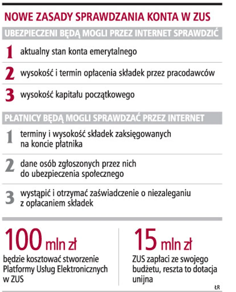 Osoby ubezpieczone w ZUS z domu przez internet będą mogły sprawdzać stan swojego konta emerytalnego. Przedsiębiorcy skontrolują terminowość i wysokość zapłaconych składek ubezpieczeniowych. Zatrudnieni będą mogli na bieżąco sprawdzać uczciwość swoich pracodawców.
