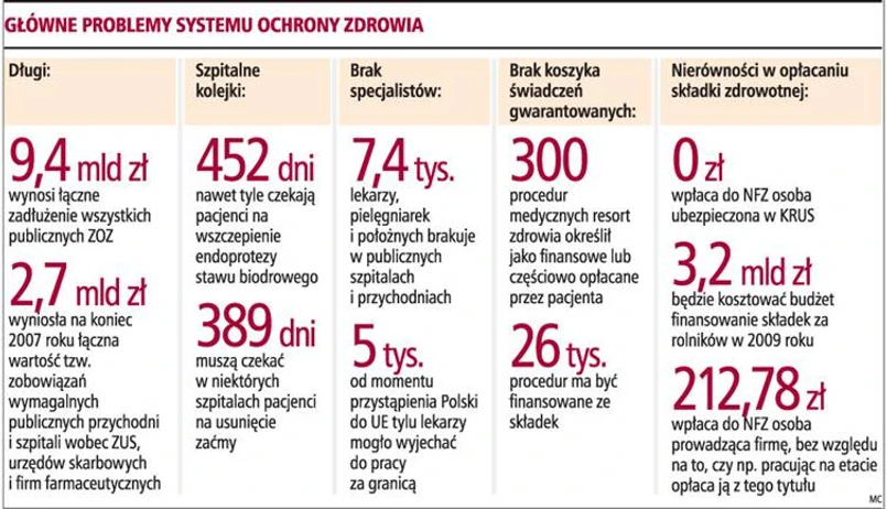 przychodnie staną się spółkami, zostaną dofinansowane z budżetu. W przyszłym roku rząd zamierza przeznaczyć na ten cel 2,7 mld zł, czyli tyle, ile na koniec 2007 roku wynosiły wszystkie zobowiązania wymagalne SP ZOZ (czyli takie, których termin płatności już minął). Zgodnie z projektem ustawy wprowadzającej ustawy z zakresu ochrony zdrowia (druk sejmowy nr 294) wszystkie publiczne zakłady opieki zdrowotnej mają zostać przypisane do jednej z trzech kategorii (A, B, C). Do pierwszej trafią te w najlepszej sytuacji finansowej, do B posiadające niewielkie zadłużenie, a do kategorii C - najbardziej zadłużone. Część ich długów zostanie umorzona. ZOZ będą mogły również starać się o poręczenia Skarbu Państwa i o preferencyjne kredyty.