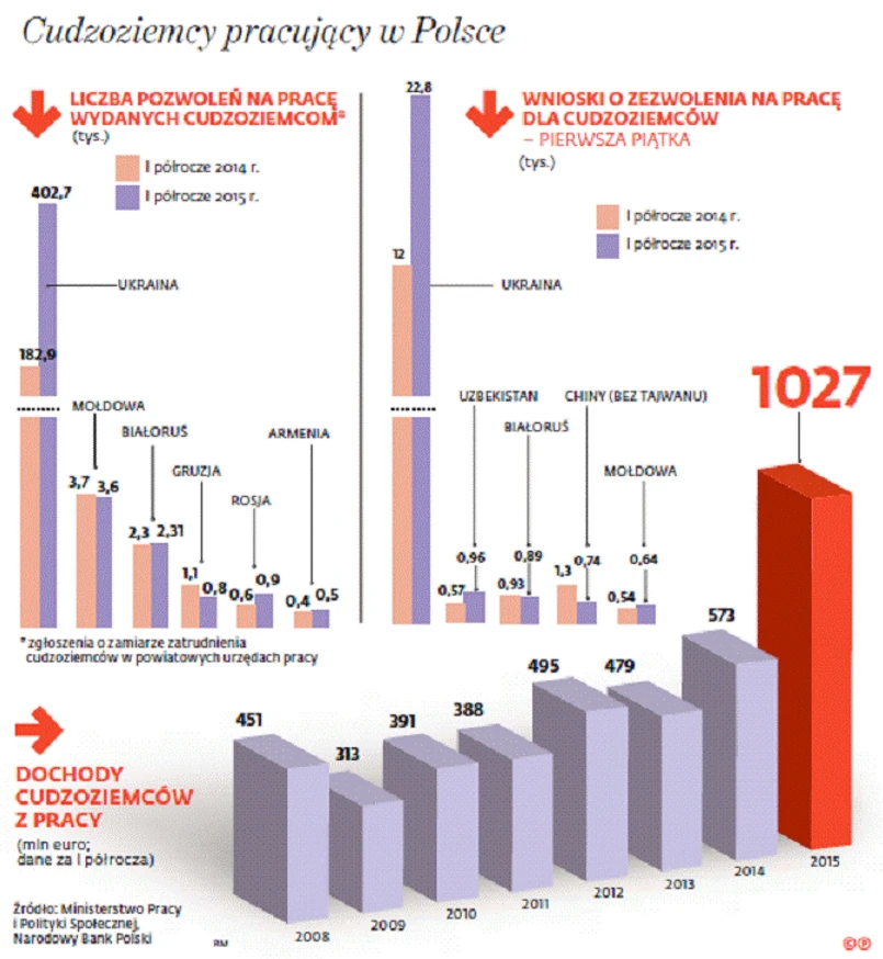 Grzegorz Dobroczek z departamentu statystyki NBP twierdzi, że w 90 proc. przypadków wypłaty dla cudzoziemców to dochody osiągane przez Ukraińców. – Coraz więcej obywateli Ukrainy przyjeżdża do Polski pracować. Odbywa się to na podstawie oświadczeń o zamiarze zatrudnienia cudzoziemców wystawianych przez polskich pracodawców. Są one rejestrowane przez Ministerstwo Pracy i Polityki Społecznej. I liczba oświadczeń wystawionych w pierwszej połowie roku była ponad dwukrotnie większa niż w pierwszej połowie 2014 r. – zwraca uwagę Dobroczek.