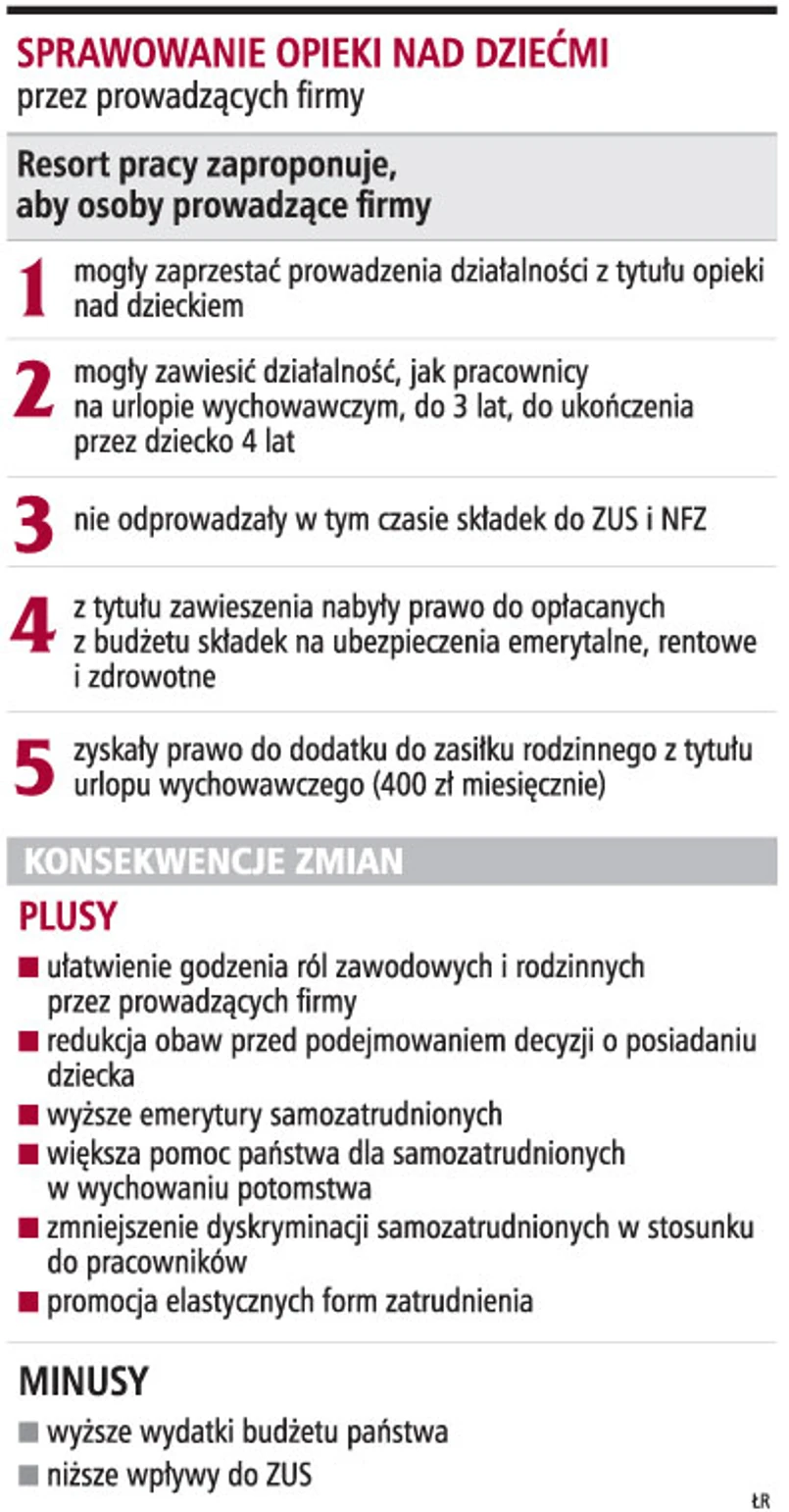 Rząd chce przyznać samozatrudnionym prawo do zaprzestania prowadzenia działalności z tytułu wychowywania dziecka. Budżet opłaci za osoby prowadzące firmę, w okresie sprawowania przez nie opieki, składki do NFZ na emeryturę i rentę. Właściciele firm będą mogli, jak pracownicy, ubiegać się o dodatek do zasiłku rodzinnego w wysokości 400 zł miesięcznie.
