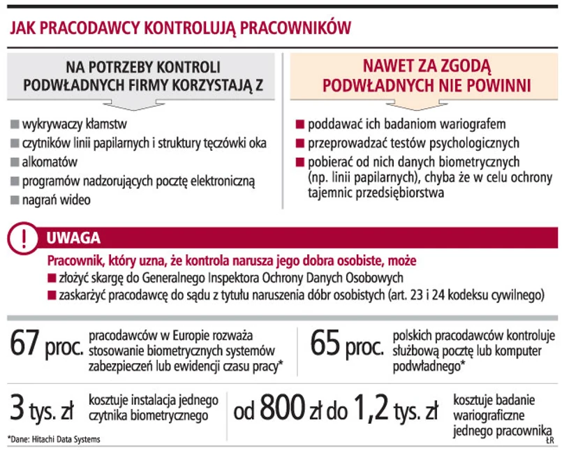 Coraz więcej pracodawców korzysta z czytników biometrycznych i wykrywaczy kłamstw. Przełożeni nie zawsze mogą pozyskiwać w ten sposób dane o pracowniku i narażają się na skargi do sądów. Firmy mają prawo do kontrolowania trzeźwości podwładnych i ich przeszukania, jeśli wcześniej ich o tym poinformują.