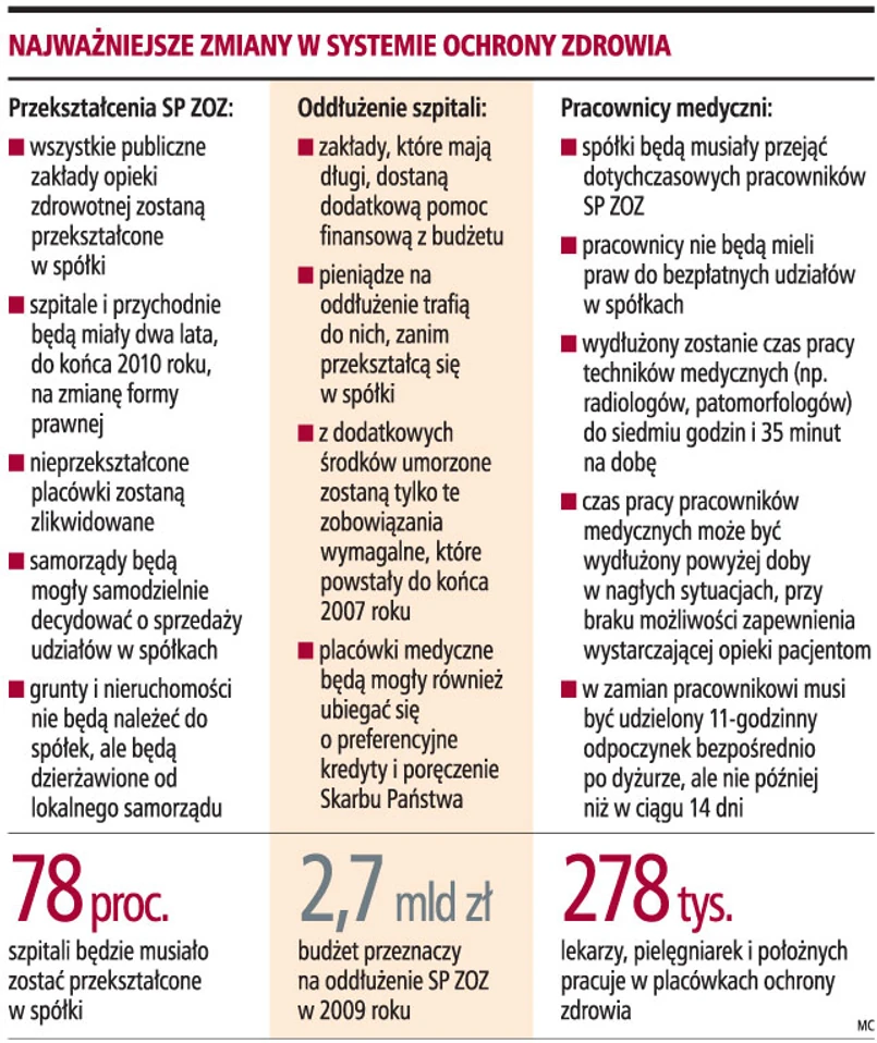 Sejm uchwalił pakiet ustaw reformujących system ochrony zdrowia. Najważniejsza zmiana dotyczy obligatoryjnego przekształcenia wszystkich samodzielnych publicznych zakładów opieki zdrowotnej (SP ZOZ) w spółki prawa handlowego. Wzbudza też ona najwięcej wątpliwości, jeżeli chodzi o dostęp do świadczeń zdrowotnych. Rząd i posłowie koalicji przekonują, że zmiana formy prawnej szpitali poprawi ich sytuację finansową, a tym samym dostęp do świadczeń zdrowotnych. Pacjent nie straci prawa do leczenia opłacanego przez NFZ. Wręcz przeciwnie - zyska dodatkowe prawa. Natomiast opozycja podkreśla, że szpitale będą nastawione wyłącznie na zysk i tym samym mogą ograniczać wykonywanie zabiegów specjalistycznych, drogich i źle wycenianych przez Fundusz.