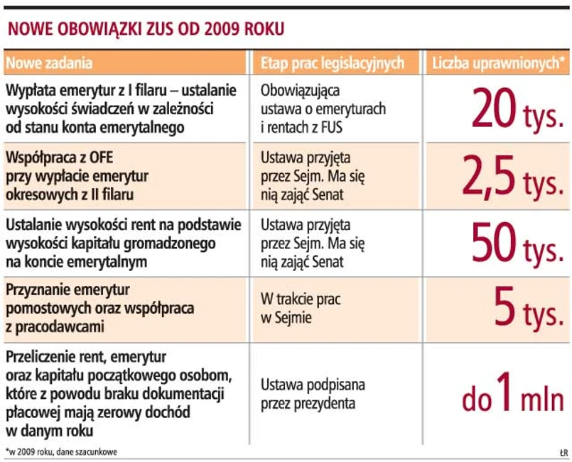 Po nowym roku od 500 tys. do miliona osób może się zgłosić do ZUS o przeliczenie świadczeń. Z takiej możliwości skorzystają ci, którzy nie z własnej winy nie mogli udowodnić wysokości zarobków za lata swojej pracy. Od nowego roku będą też przyznawane nowe renty z tytułu niezdolności do pracy ustalane na podstawie kapitału zgromadzonego na koncie emerytalnym. Równocześnie kobiety, które w 1999 roku przystąpiły do OFE, po raz pierwszy otrzymają emerytury okresowe. Także od stycznia mają być wypłacane emerytury pomostowe. Te zadania ZUS będzie wykonywać, mimo że nad częścią ustaw, które mają regulować sposób ich realizacji, wciąż pracują posłowie. To powoduje, że rosną obawy, czy ZUS poradzi sobie z nowymi zadaniami. Tym bardziej że eksperci rynku informatycznego ostrzegają, że ZUS nie ma wystarczająco dużo czasu, aby przygotować się informatycznie do ich realizacji.
