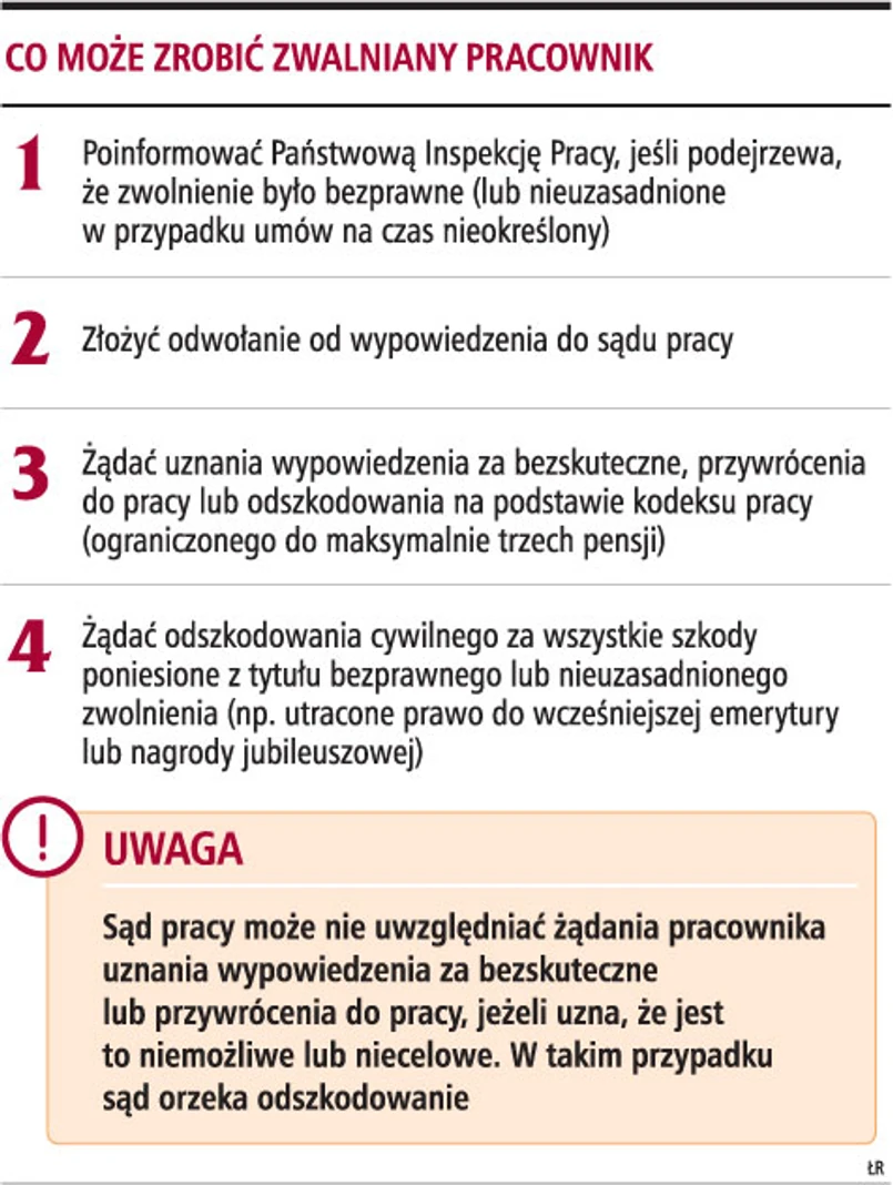 Pracodawca w takiej sytuacji musi skonsultować zamiar zwolnienia ze związkami zawodowymi i zawrzeć z nimi porozumienie, które określi zasady postępowania w sprawach dotyczących pracowników objętych zwolnieniami. Jest zobowiązany także do wypłaty odpraw zwalnianym pracownikom. Po spełnieniu całej procedury określonej w ustawie z 13 marca 2003 r. o szczególnych zasadach rozwiązywania z pracownikami stosunków pracy z przyczyn niedotyczących pracowników (Dz.U. nr 90, poz. 844 z późn. zm.), w ciągu 30 dni firma może rozwiązać stosunek pracy z więcej niż dziesięcioma pracownikami (gdy zatrudnia mniej niż 100 pracowników), więcej niż 10 proc. pracowników (jeżeli zatrudnia co najmniej 100 osób, ale mniej niż 300) oraz 30 pracowników (jeśli zatrudnia co najmniej 300 lub więcej pracowników).