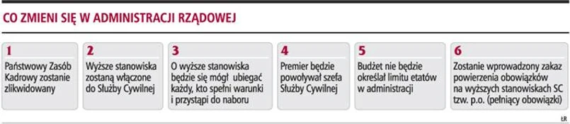 Szef Służby Cywilnej będzie wybierany spośród urzędników mianowanych, a nie polityków. Niektórzy dyrektorzy, którzy zostali wpisani do Państwowego Zasobu Kadrowego, będą musieli przystąpić do naboru. O pracę w urzędzie będą mogli ubiegać się cudzoziemcy, ale będą musieli znać język polski.