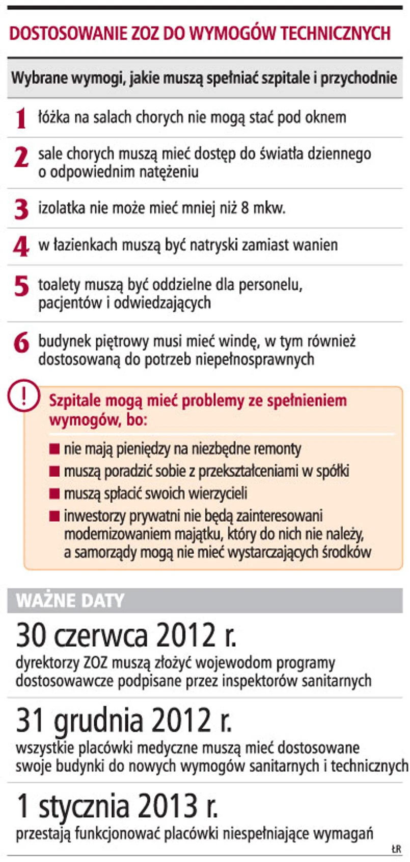 14 mld zł będzie kosztować placówki medyczne dostosowanie się do nowych warunków technicznych i sanitarnych. Placówki, które do końca 2012 roku nie spełnią nowych standardów, nie będą mogły leczyć pacjentów. Konieczność przeprowadzenia kosztownych remontów może zniechęcić prywatne podmioty do inwestycji w szpitale-spółki.