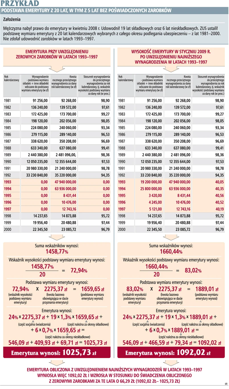 Uprawniony do emerytury od kwietnia 2008 r. udowodnił 27 lat składkowych oraz 6 lat nieskładkowych. ZUS obliczył mu emeryturę z 20 lat kalendarzowych wybranych z całego okresu podlegania ubezpieczeniu, tj. 1981-2000. Za lata 1993 i 1994 nie mógł potwierdzić wysokości zarobków. Wysokość udokumentowanych wynagrodzeń za pozostałe lata wymieniono w tabeli na stronie E2 Podstawa wymiaru emerytury obliczonej z 20 lat dla osoby, której ZUS przyjął zerowe wynagrodzenia za lata 1993-1994, wyniosła - 1988,22 zł = 2275,37 zł x 87,38 proc. (patrz obliczenia na stronie E2). Emeryturę ZUS obliczył w następujący sposób: