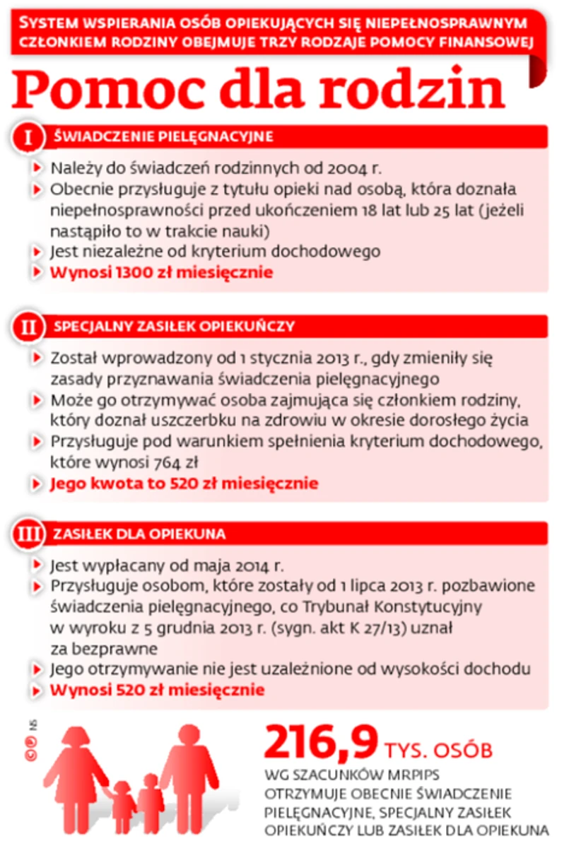 Senacki projekt realizuje wyrok Trybunału Konstytucyjnego z 18 listopada 2014 r. (sygn. akt SK 7/11). TK orzekł w nim, że art. 17 ust. 5 pkt 4 ustawy z 28 listopada 2003 r. o świadczeniach rodzinnych (t.j. Dz.U. z 2015 r. poz. 114 ze zm.) jest niezgodny z prawem w takim zakresie, w jakim uniemożliwia przyznanie świadczenia pielęgnacyjnego rodzicowi, który zrezygnował z pracy, aby zajmować się niepełnosprawnym dzieckiem, jeśli drugi z nich otrzymuje tę formę wsparcia z powodu zajmowania się innym chorym potomkiem. Zgodnie z przepisem wspomniana pomoc finansowa nie przysługuje, gdy osoba w rodzinie ma ustalone prawo do dodatku do zasiłku z tytułu opieki nad dzieckiem w trakcie urlopu wychowawczego lub świadczenia pielęgnacyjnego.