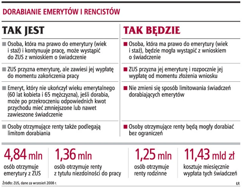 Obecnie ZUS zmniejsza emerytury i renty, jeśli kwota dodatkowego przychodu przekroczy 70 proc. przeciętnego wynagrodzenia (od 1 września 2066,00 zł). Jeśli przekroczy 130 proc. średniej płacy (3836,80 zł), ZUS w ogóle zawiesza wypłatę emerytury. Jeszcze bardziej restrykcyjne zasady dotyczą osób otrzymujących zasiłki i świadczenia przedemerytalne. W 2007 roku ZUS zmniejszył lub zawiesił wypłatę 47 tys. świadczeń. Stanowi to zaledwie 0,6 proc. spośród 7,45 mln emerytur i rent przez niego wypłacanych.