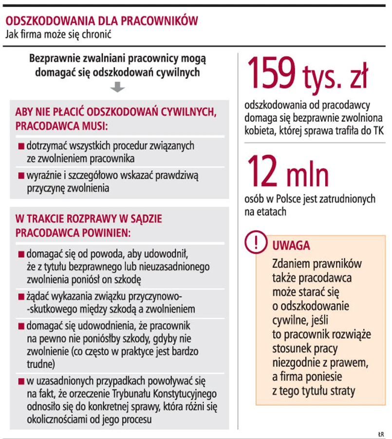 Jeżeli pracownik złoży pozew o odszkodowanie do sądu, pracodawcom pozostaje bronić się w trakcie procesu. Ułatwieniem dla nich będzie fakt, że Senat odrzucił projekt nowelizacji kodeksu pracy, który bezpośrednio umożliwiał pracownikom ubieganie się o odszkodowanie cywilne za bezprawne zwolnienie. Podwładni, którzy domagają się odszkodowania cywilnego, nie będą mogli powoływać się na konkretny przepis k.p., lecz tylko na orzeczenie Trybunału Konstytucyjnego.