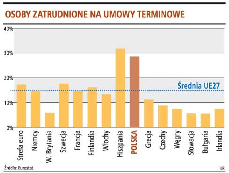 W Polsce padają rekordy zawieranych umów o pracę na czas określony. Pod tym względem nasz kraj w Europie minimalnie wyprzedza jedynie Hiszpania - wynika z monitoringu Eurostatu. Wobec powszechności tych praktyk Komisja Kodyfikacyjna Prawa Pracy zaproponowała w projekcie kodeksu pracy zmianę zmierzającą do ograniczenia zasięgu czasowego tej praktyki poprzez wprowadzenie przepisu stanowiącego, że łączny okres zatrudnienia u danego pracodawcy na podstawie kolejnych umów o pracę na czas określony nie może przekraczać trzech lat. Obecnie obowiązujące przepisy mówią jedynie, że zawarcie trzeciej umowy na czas określony jest równoznaczne z zawarciem umowy na czas nieokreślony. Prowadzi do sytuacji, w których kontrakty z pracownikami zawierane są nierzadko na dziesięć i więcej lat.