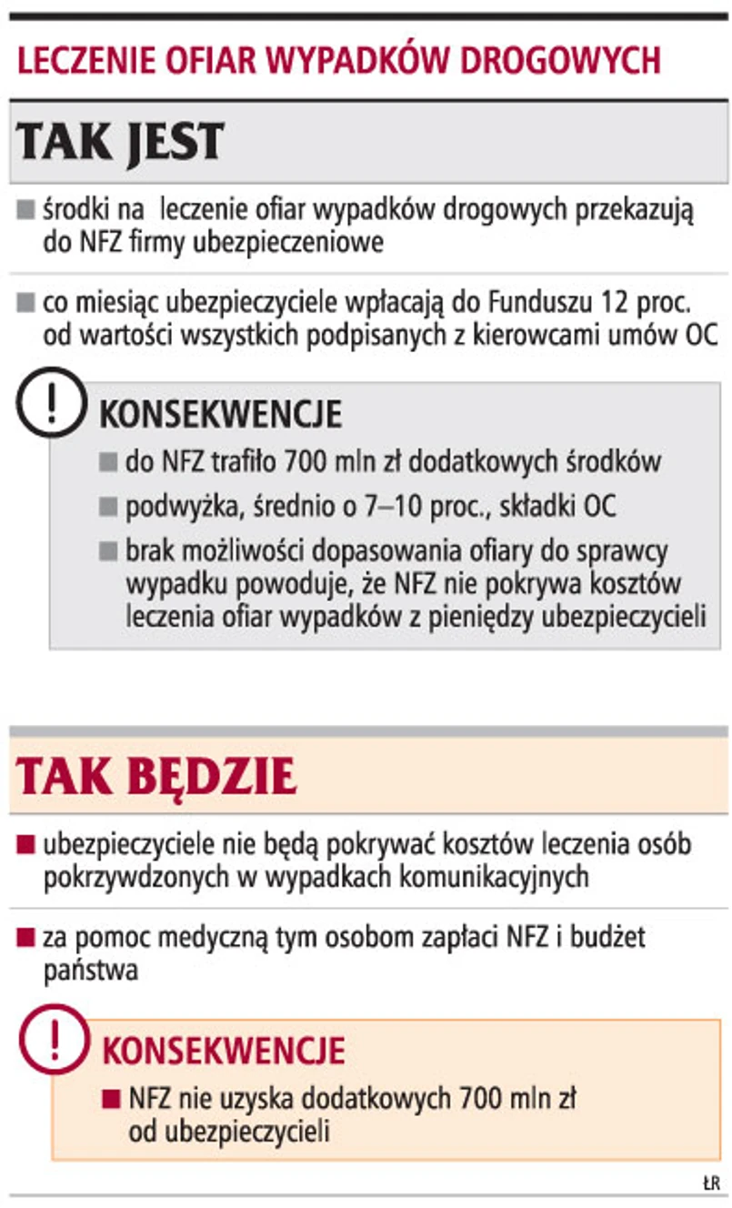 Od przyszłego roku firmy ubezpieczeniowe nie będą musiały pokrywać kosztów leczenia ofiar wypadków drogowych. Ceny obowiązkowych polis OC dla kierowców nie zostaną obniżone, a mogą wręcz wzrosnąć. 700 mln zł uzyskane od ubezpieczycieli NFZ będzie mógł przeznaczyć na pokrycie kosztów wszystkich świadczeń.