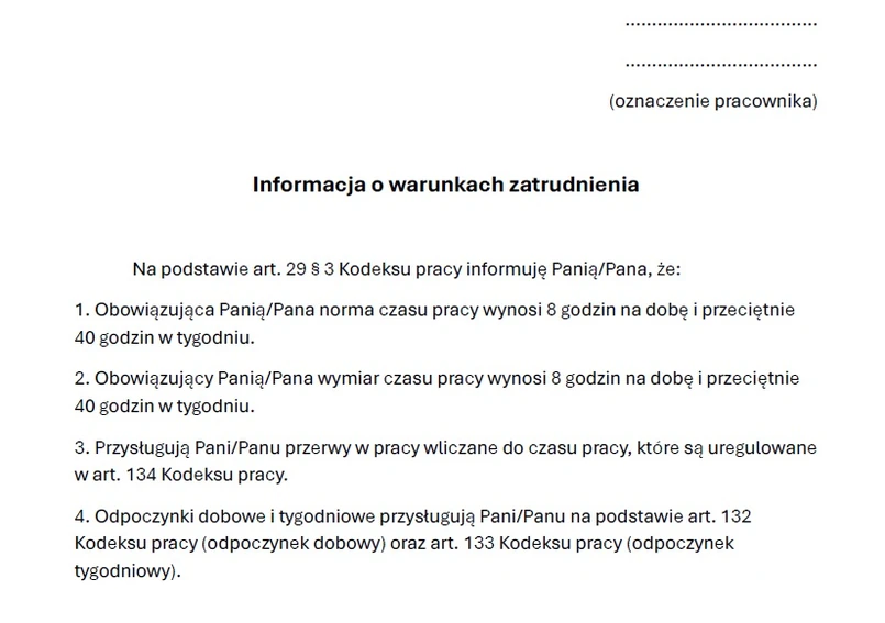 Oto wzór informacji o warunkach zatrudnienia do pobrania: doc i pdf
