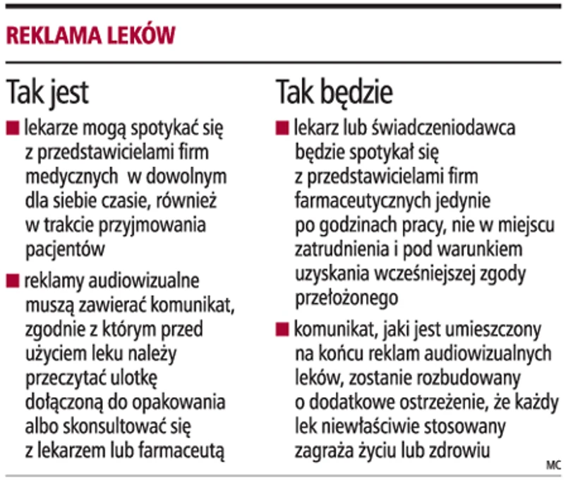 Ewa Kopacz, minister zdrowia, podpisała rozporządzenie w sprawie reklamy produktów leczniczych. Czeka ono na publikację w Dzienniku Ustaw. Jego przepisy wejdą w życie z dniem ogłoszenia. Natomiast artykuł wprowadzający nowe zasady organizowania spotkań przedstawicieli firm farmaceutycznych z lekarzami zacznie obowiązywać już od 1 grudnia. To on wzbudza najwięcej kontrowersji w środowisku medycznym, bo wprowadza zakaz spotykania się przedstawicieli firm medycznych z lekarzami lub świadczeniodawców w ich godzinach pracy. Poza tym spotkanie nie może się odbywać w miejscu pracy, czyli np. w przychodni czy w szpitalu. Aby mogło się ono w ogóle odbyć, przedstawiciel medyczny lub handlowy będzie musiał dodatkowo uzyskać na to zgodę kierownika placówki medycznej, w której pracuje konkretny medyk.