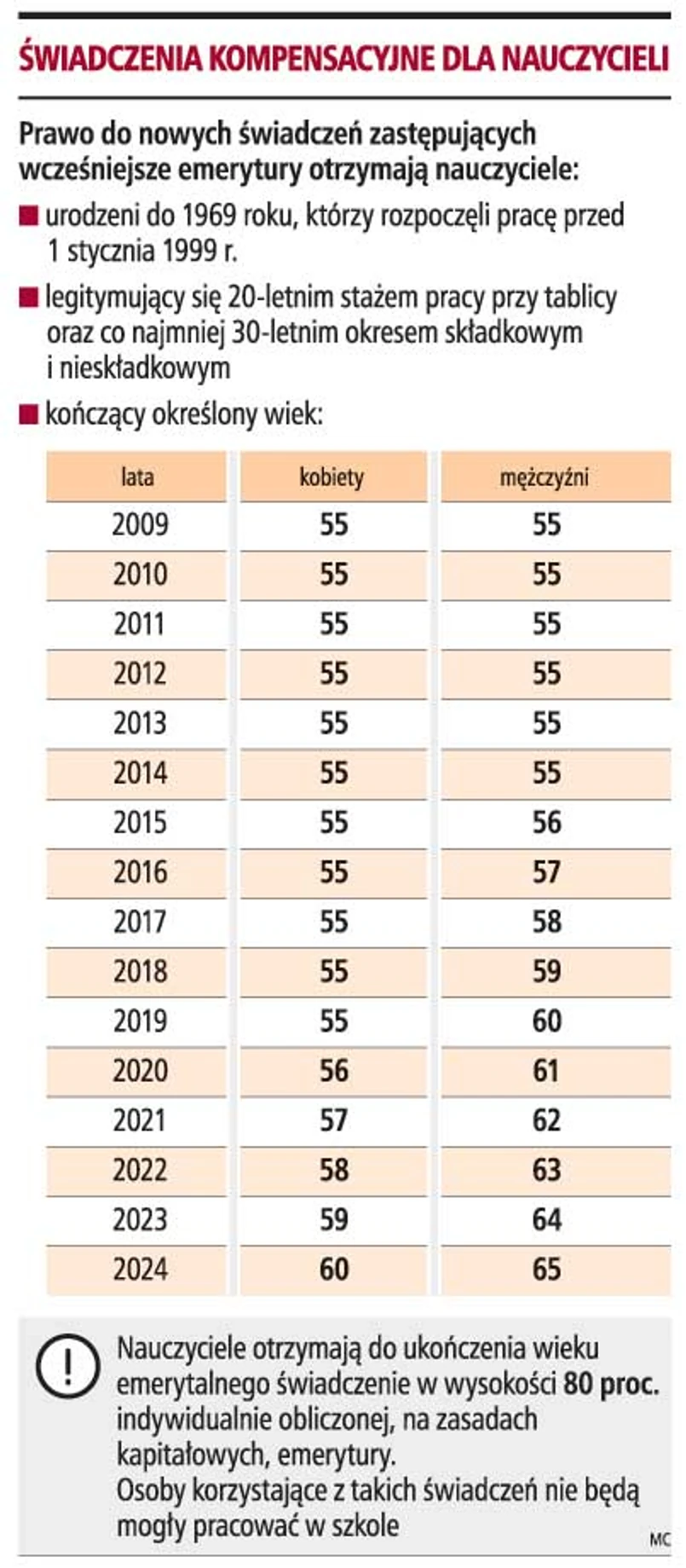 Projekt zakłada, że prawo do wcześniejszego zakończenia aktywności zawodowej zyskają osoby, które będą się legitymować okresem składkowym i nieskładkowym wynoszącym 30 lat, w tym 20 lat pracy w szkole przy tablicy, o ile pracę taką rozpoczęli przed 1 stycznia 1999 r. Z możliwości wcześniejszego odejścia z rynku pracy nie skorzystają jednak m.in. doradcy metodyczni oraz wychowawcy w internatach. Równocześnie nauczyciele otrzymujący świadczenia kompensacyjne nie będą mogli nadal pracować w szkołach.