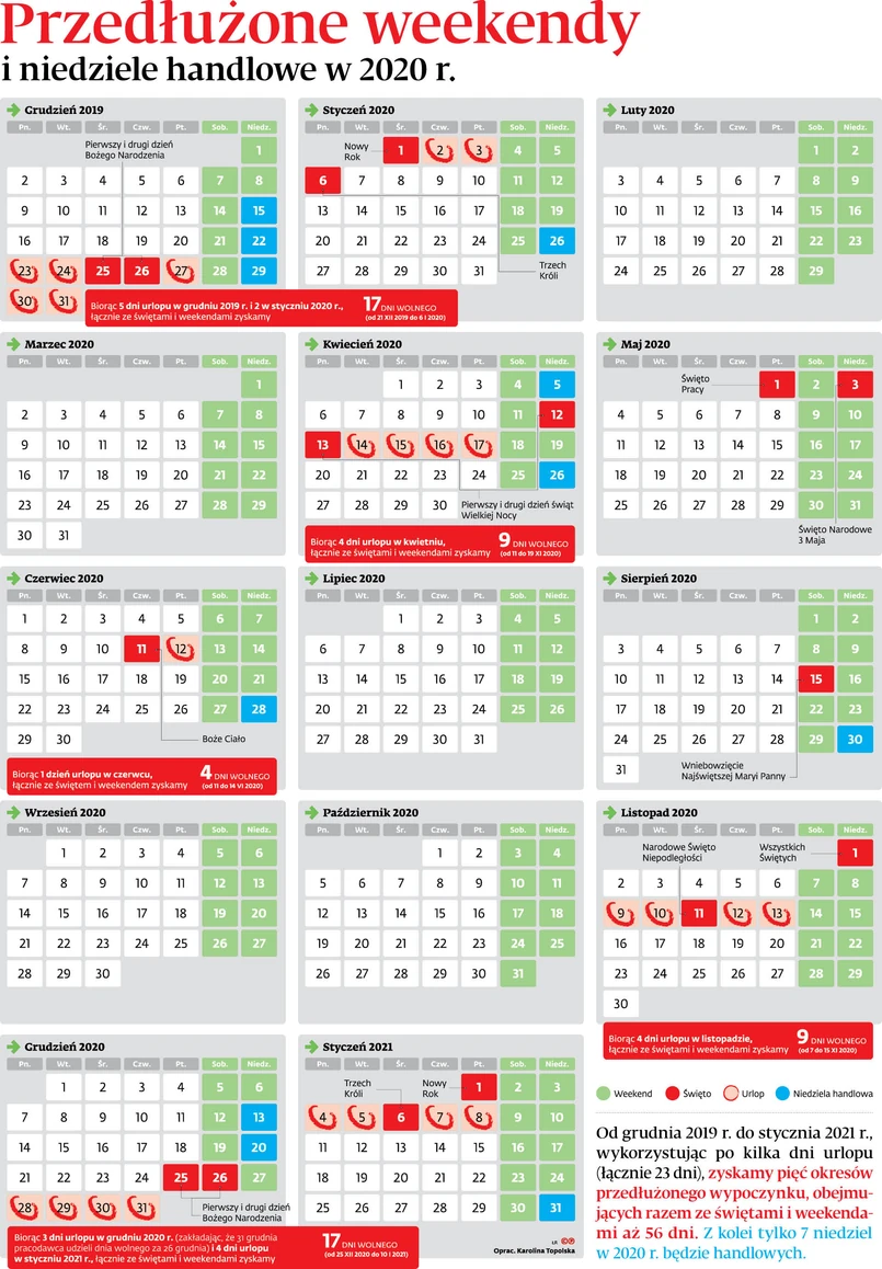 Przedłużone weekendy i niedziele handlowe w 2020 r.