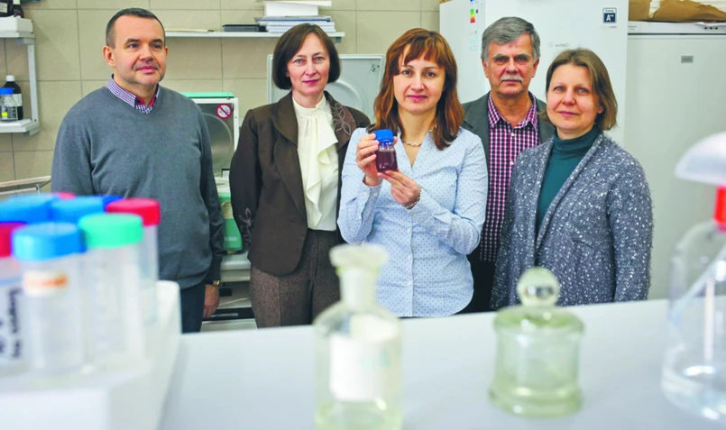 Poszukiwacze leku dla pszczół (od lewej): dr hab. Grzegorz Borsuk z Uniwersytetu Przyrodniczego w Lublinie oraz naukowcy z UMCS: dr hab. Agnieszka Zdybicka-Barabas, dr Aneta Ptaszyńska, prof. Wiesław Mulenko, prof. Małgorzata Cytryńska. W pracach nad wynalazkiem brał udział także dr Daniel Załuski z Uniwersytetu Jagiellońskiego
