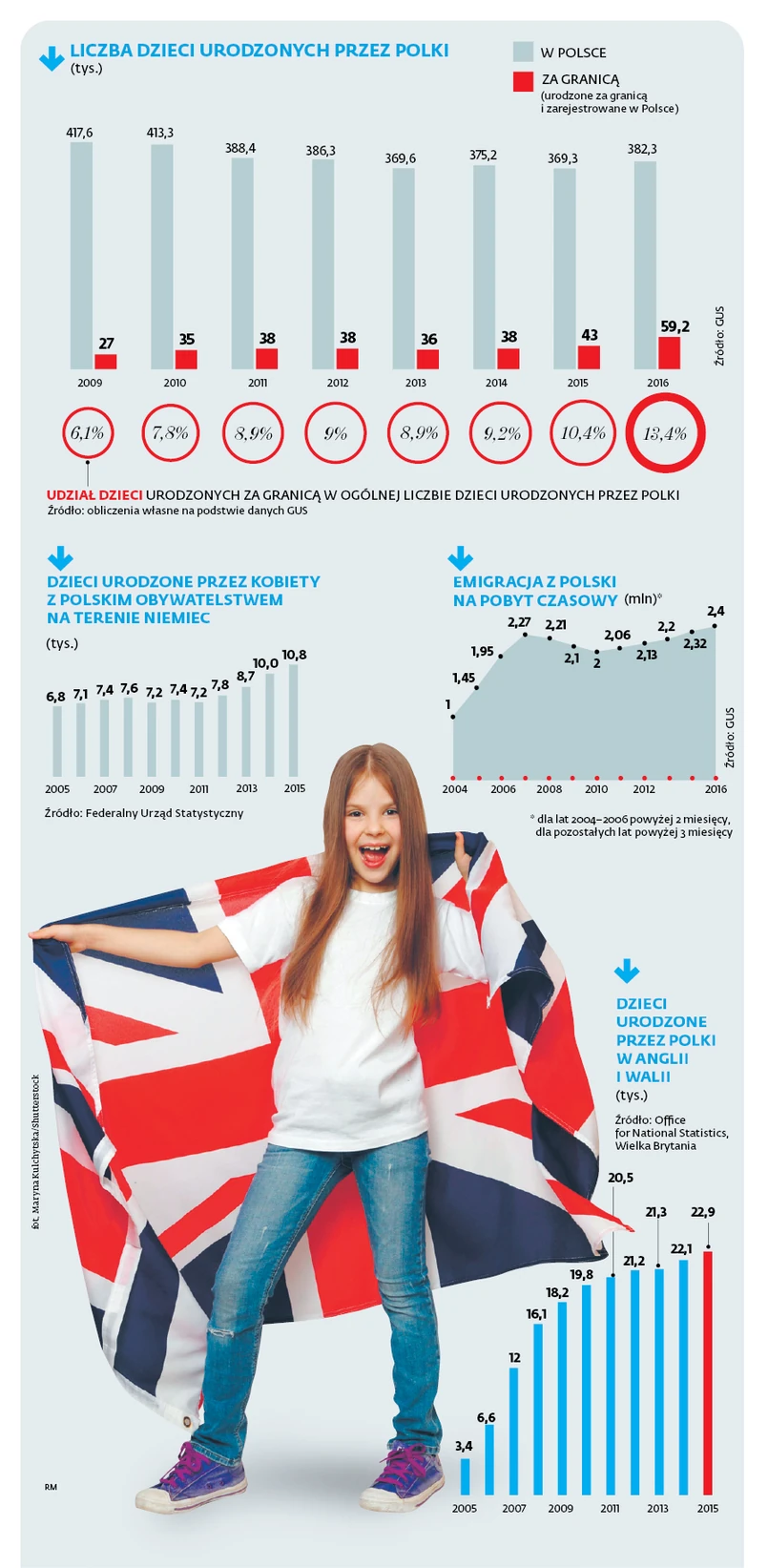 Z danych GUS wynika także, że od 2009 r., gdy zaczęto zbierać takie informacje, emigranci zarejestrowali już ponad 314 tys. dzieci urodzonych poza naszym krajem.