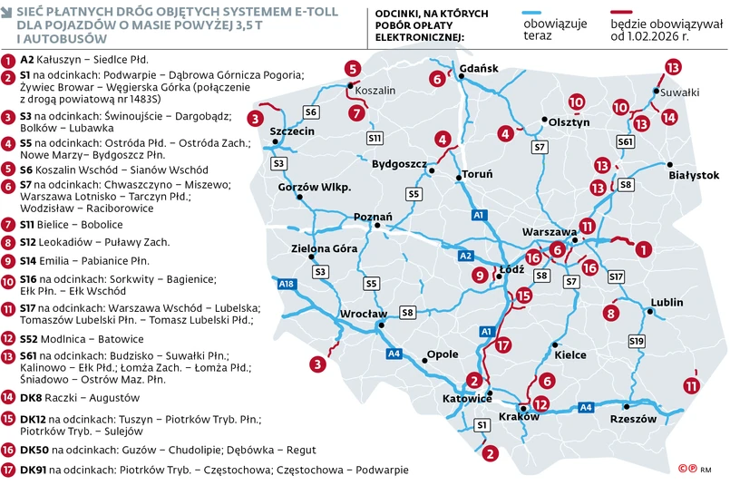 Zmiany opłat na drogach, które początkowo planowano na 1 grudnia, mają wejść w życie 1 lutego. To konsekwencja uzgodnionych z Unią Europejską zapisów w kamieniach milowych związanych z Krajowym Planem Odbudowy. Rozszerzenie płatnej sieci dróg dla pojazdów ciężkich będzie dotyczyć 645 km – głównie oddanych w ostatnich miesiącach tras szybkiego ruchu. Chodzi np. o autostradę A2 z Kałuszyna do Siedlec, trasę S3 ze Świnoujścia do okolic Wolina i z Bolkowa do Lubawki, trasę S7 z Warszawy do Tarczyna, a także o odcinki drogi krajowej nr 50, którą jeździ dużo ciężarówek. To kolejne powiększenie tej siatki po 15-miesięcznej przerwie.