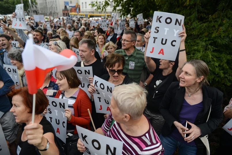 Na ul. Nowogrodzkiej w Warszawie przy dźwiękach bębnów uczestnicy skandowali: "My dziś wszyscy tu stoimy, państwo prawa obronimy!". Wyrażano też niezadowolenie z decyzji prezydenta Andrzeja Dudy o podpisaniu ustawy o ustroju sądów powszechnych.