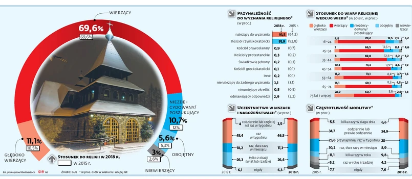Ten spadek to głównie efekt kurczenia się odsetka osób należących do Kościoła rzymskokatolickiego. W ciągu trzech lat zmniejszył się on o blisko 1 pkt proc. – do 91,9 proc. – wynika z badań GUS. Równocześnie zwiększył się nieco odsetek osób identyfikujących się z wiarą. Obecnie 81 proc. osób uznaje się za wierzące, podczas gdy w 2015 r. było ich o 0,6 pkt proc. mniej.