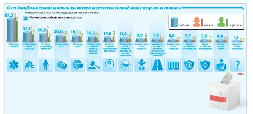 Natomiast niski poziom wskazań w sondażu na kwestie często podkreślane przez PiS – bezpieczeństwo wewnętrzne i zewnętrzne – może sugerować, że Polacy nie czują się zagrożeni. Stosunkowo mała liczba wskazań padła na kwestie dotyczące zwiększenia liczby mieszkań, inwestycji w drogi lokalne i połączenia komunikacyjne oraz kwestii wynegocjowania dobrego budżetu unijnego. W każdej z tych kwestii PiS radzi sobie co najwyżej średnio. Program „Mieszkanie plus” jest wciąż daleki od spodziewanej skali, Fundusz Dróg Samorządowych rozkręca się bardzo powoli, a samorządy nie są zbyt zainteresowane rewitalizacją nierentownych linii PKS z udziałem pieniędzy państwowych. Z kolei w negocjacjach nowego budżetu unijnego jest duże prawdopodobieństwo, że Polska otrzyma dużo mniejsze pieniądze niż na lata 2014–2020. Odpowiedzi z sondażu sugerują jednak, że nawet jeśli nowy rząd zawiedzie na którymś z tych pól, to nie będzie to musiało z automatu oznaczać wysokiej politycznej ceny. – Cena ta może być wysoka wtedy, jeśli te problemy nałożą się na ogólną dekoniunkturę ekonomiczną – ocenia prof. Rafał Chwedoruk.