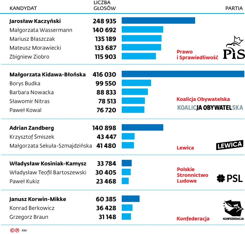 Mimo wyniku słabszego od tegorocznej rekordzistki Małgorzaty Kidawy-Błońskiej Jarosław Kaczyński pozostaje posłem PiS z najlepszym wynikiem. Prym we własnych partiach potwierdzili też Władysław Kosiniak-Kamysz i Janusz Korwin-Mikke.
