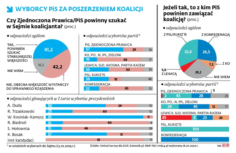 Sondaż United Surveys dla DGP i RMF FM pokazuje, że wśród wyborców PiS popularna jest idea powiększenia koalicji. Wśród ogółu poparcie dla takiego pomysłu i sprzeciw wobec niego deklaruje podobny odsetek ankietowanych. Wśród osób, które w ostatnich wyborach do Sejmu głosowały na PiS, 57 proc. uważa, że rząd powinien szukać dodatkowego wsparcia.