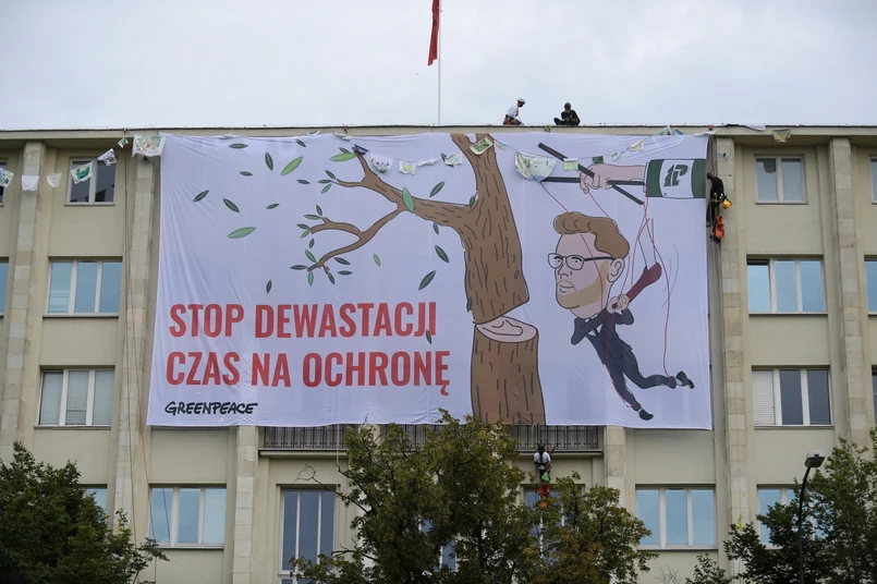 W poniedziałek 15 aktywistów organizacji Greenpeace wspięło się na dach Ministerstwa Środowiska i rozwiesiło baner z napisem "Stop dewastacji! Czas na ochronę" oraz wizerunkiem, który ma przedstawiać szefa resortu Michała Wosia wycinającego drzewo. Baner o wymiarach 9 m na 16 m został wykonany z tzw. tkaniny flagowej. 11 działaczy przebywało na dachu, zaś czterech wisiało na linach zamontowanych na budynku.