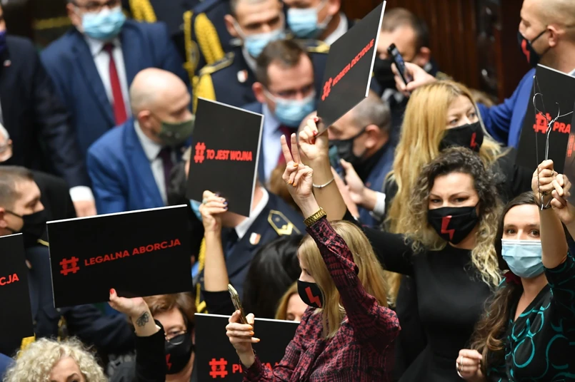 Wtedy na mównicę wbiegła posłanka KO Małgorzata Tracz, która miała na twarzy maseczkę z symbolem protestu przeciwko wyrokowi TK - czerwoną błyskawicą. "Panie marszałku, wysoka izbo na naszych oczach toczy się historia, od 6 dni tysiące młodych ludzi na ulicach polskich miast protestują, protestują w obronie swojej godności, w obronie swojej wolności, w obronie prawa do wyboru, w obronie prawa do aborcji. To jest wojna i wy tę wojnę przegracie. A kto jest za tę wojnę odpowiedzialny? Panie wiceministrze Kaczyński, to jest pana odpowiedzialność" - mówiła Tracz zwracając się do prezesa PiS i rządzących.