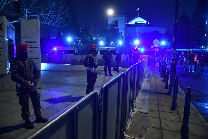 Bariery, za którymi stoją policjanci i żołnierze ŻW, odgradzają ponadto Pomnik Armii Krajowej i Polskiego Państwa Podziemnego oraz dojście pod Sejm od ulicy Matejki.