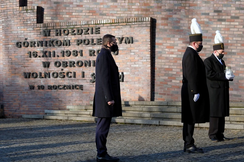 "Wszyscy, którzy jesteśmy dzisiaj dziećmi tamtej odwagi, walki o wolność, o solidarność chylimy czoła i dziękujemy za poświęcenie, za odwagę, za to, że tamta krew (...) wytyczyła drogę do solidarności, do wolności i drogę do niepodległej Rzeczypospolitej" – powiedział premier Morawiecki po złożeniu kwiatów pod znajdującym się przy kopalnianym murze Krzyżu-Pomniku, upamiętniającym tragedię.