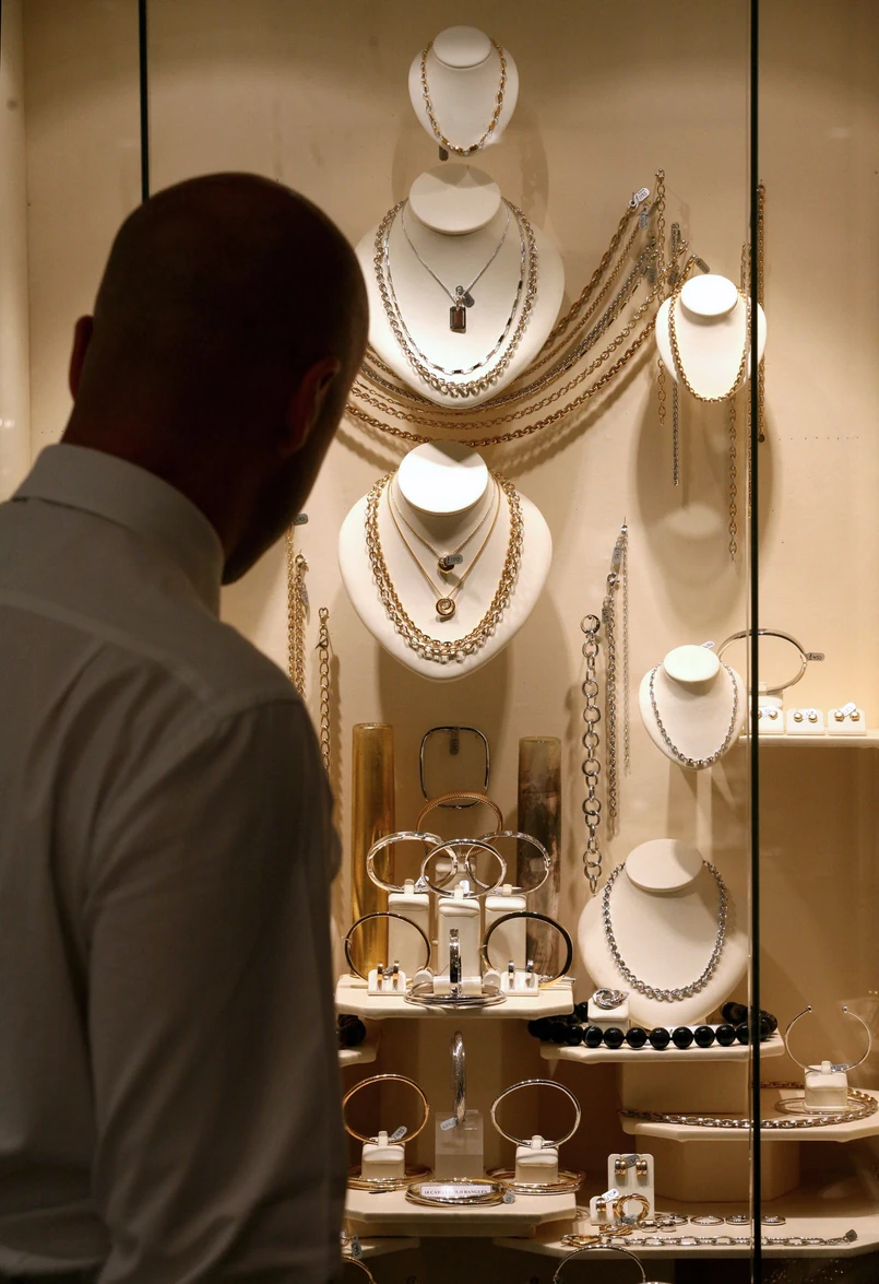 Mężczyzna w garniturze wszedł do eleganckiego sklepu, wyciągnął broń i zmusił personel do wręczenia mu ok. 15 sztuk biżuterii - podała policja.