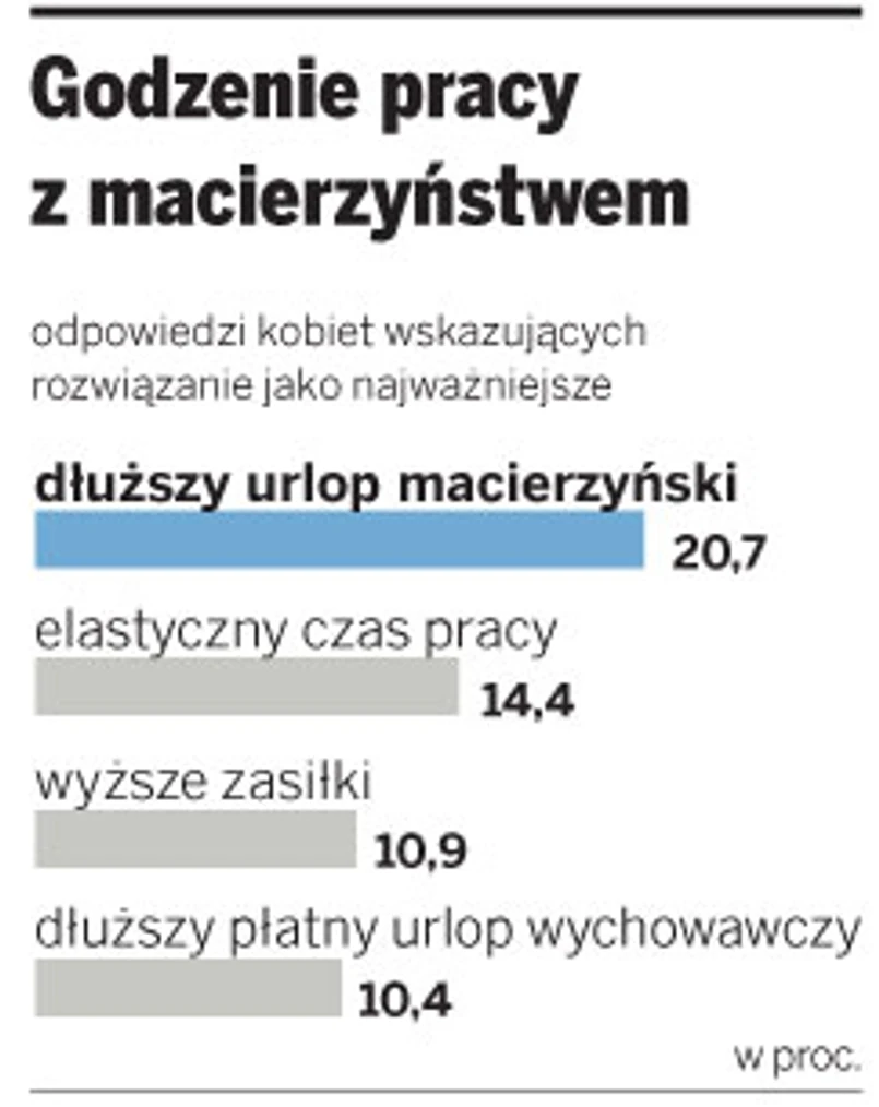 Polacy mają konkretne propozycje, jak pogodzić pracę z macierzyństwem. Uważają, że należałoby wydłużyć urlop macierzyński. Podoba im się także elastyczny czas pracy, ale tylko w teorii, bo – jak wynika z Diagnozy – na pracę w niepełnym wymiarze decyduje się jedynie kilka procent osób.
