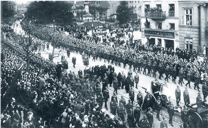 Marszałka Józefa Piłsudskiego żegnało około 250 tys. osób. Uroczystości pogrzebowe trwały przez 5 dni – od 13 do 18 maja 1935 roku. Ocenia się, że to była największa taka uroczystość w Polsce. Piłsudski zmarł w Belwederze, który natychmiast zamieniono w kaplicę żałobną. Na katafalku była wystawiona jego trumna ze srebra. Obok niego stała kryształowa urna z sercem Marszałka. W głębi sali siedziały córki i żona i przyjmowały kondolencje. Potem trumnę z ciałem przewiezionego do katedry. Tam przychodziły tłumy. W Krakowie trumnę witały tłumy. Przeniesiono ją do kościoła Mariackiego. Za nią szedł 100-tysięczny tłum. Zabił dzwon Zygmunta. Po nabożeństwie generałowie złożyli trumnę w krypcie św. Leonarda. Wtedy zabił ponownie dzwon Zygmunta, a na wawelskim wzgórzu działa oddały 101 strzałów armatnich. W całym kraju zapanowała trzyminutowa cisza. W pogrzebie uczestniczyło ćwierć miliona ludzi. Przybyli przedstawiciele 16 państw.