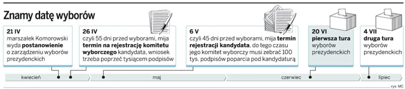 Takie decyzje o wyborczym kalendarzu zapadły wczoraj podczas spotkania marszałka Sejmu z przedstawicielami klubów parlamentarnych. Choć oficjalnie żadna data nie padła, Bronisław Komorowski poinformował, że postanowienie o zarządzeniu wyborów podpisze 21 kwietnia. Termin podany przez marszałka determinuje przeprowadzenie pierwszej tury tylko w jednym możliwym terminie – 20 czerwca. Żaden inny nie daje czasu na rejestrację komitetów wyborczych kandydatów na prezydenta.