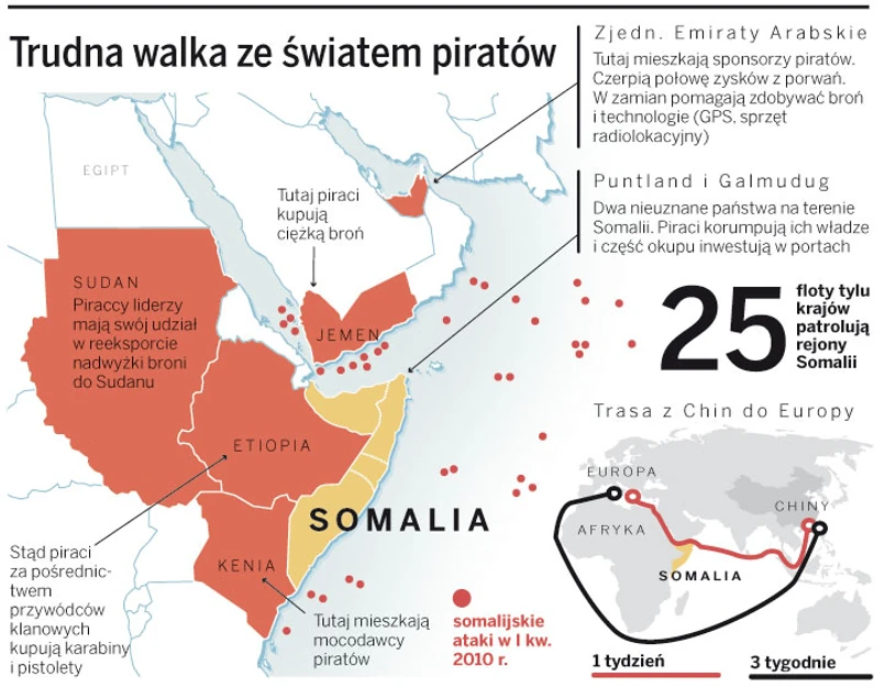 Statek, który płynął z Sudanu do Chin z 86 tys. ton ropy wartej 52 mln dol., został zaatakowany 5 maja. Już następnego dnia odbili go komandosi z okrętu „Marszał Szaposznikow”. Siedem rosyjskich jednostek wojennych od wielu miesięcy patroluje północno-zachodnią część Oceanu Indyjskiego. Ten niebezpieczny akwen stanowi zarazem najkrótszą drogę Azja – Europa. Trasa wokół południowego rogu Afryki jest o dwa tygodnie dłuższa i znacznie droższa.
