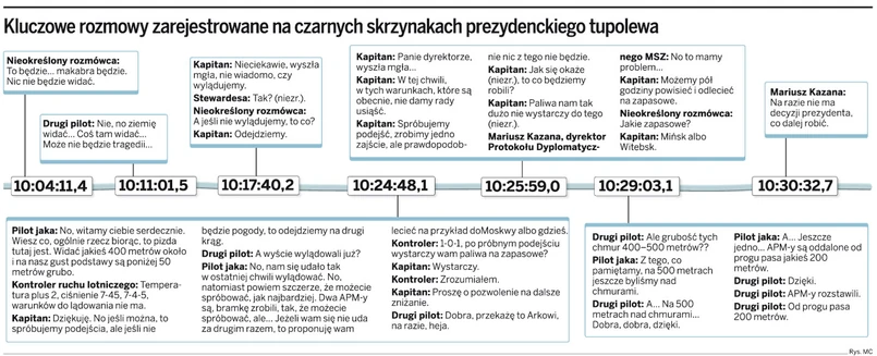 Wiadomo, że załoga miała świadomość fatalnej pogody. – Do wysokości 100 m wszystko szło zgodnie z procedurami, ale nie wiem jednak, dlaczego podjęli decyzję o zejściu poniżej tej bezpiecznej wysokości – komentuje Pietrzak. Stenogram nie przynosi odpowiedzi na to pytanie. Wiadomo, że o 10.26 w kabinie pojawił się szef Protokołu Dyplomatycznego z MSZ Mariusz Kazana. Usłyszał od kapitana, że warunków do lądowania nie ma. Cztery minuty później pojawia się ponownie. Informuje dowódcę, że „na razie nie ma decyzji prezydenta, co dalej robić”. To jedyna wzmianka o prezydencie w stenogramie.