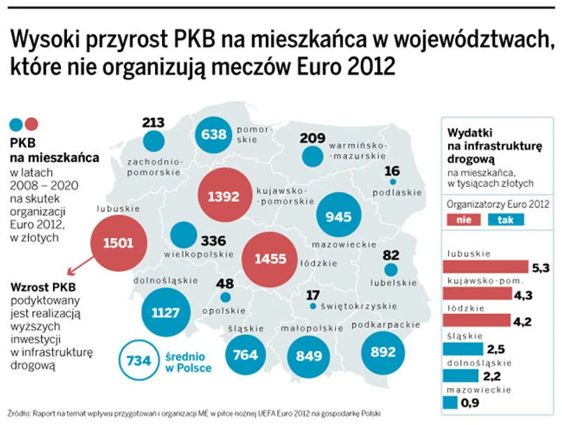 Według autorów raportu dzięki organizacji mistrzostw skorzystają wszystkie regiony kraju. A nasz PKB może powiększyć się nawet o 36 mld zł. Najlepszy okres ma nastąpić w 2012 r., bo wtedy nasza gospodarka zarobi na Euro od 5,5 do 9,5 mld zł. Trzy czwarte tego wzrostu ma wziąć się z przyspieszenia w budowie infrastruktury, a po kolejne 7 proc. dadzą związane z organizacją mistrzostw, napływ inwestycji zagranicznych oraz zwiększenie liczby turystów.