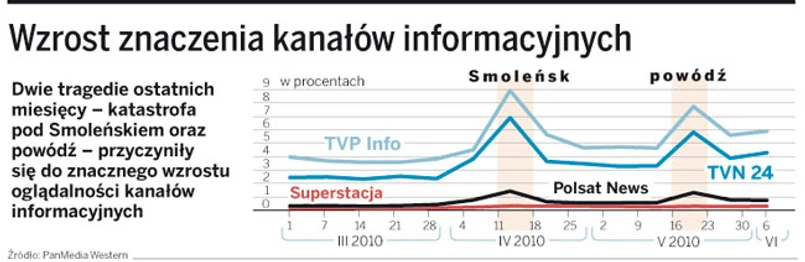 Stacje newsowe zbierają plony. W ciągu ostatnich dwóch miesięcy oglądalność skoczyła im nawet trzykrotnie. Widzów przykuły do telewizora narodowe tragedie i wybory - katastrofa pod Smoleńskiem i powódź.