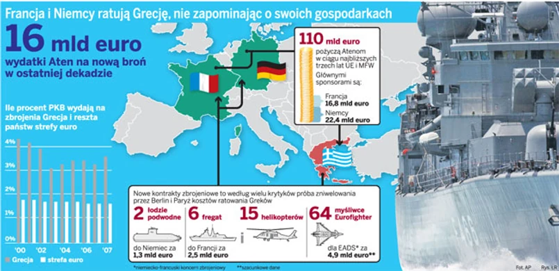 Mimo oszczędności Ateny wydają miliardy na nowe okręty wojenne. W ten sposób rząd Georgiosa Papandreu odwdzięcza się za pakiet pomocowy, który ma wyciągnąć kraj z kryzysu. Na zbrojeniach zarabiają Berlin i Paryż, które ten pakiet sfinansowały