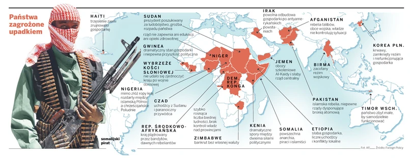 Według listy „Foreign Policy” żaden kontynent nie jest wolny od wadliwie funkcjonujących państw. W Ameryce niechlubny prym wiedzie Haiti, wytrącone z torów po styczniowym trzęsieniu ziemi. Azja to m.in. Afganistan, Irak, Jemen i Pakistan – tlące się bądź otwarte rebelie, rządy nieuznawane na części terytorium, tysiące uchodźców. To także Birma i Korea Płn. z represyjnymi reżimami. Dwanaście państw z krytycznej dwudziestki leży w Afryce. Na czele z Somalią – państwem, które istnieje tylko na mapie, a w rzeczywistości jest terytorium rozdartym między kilkunastu watażków.