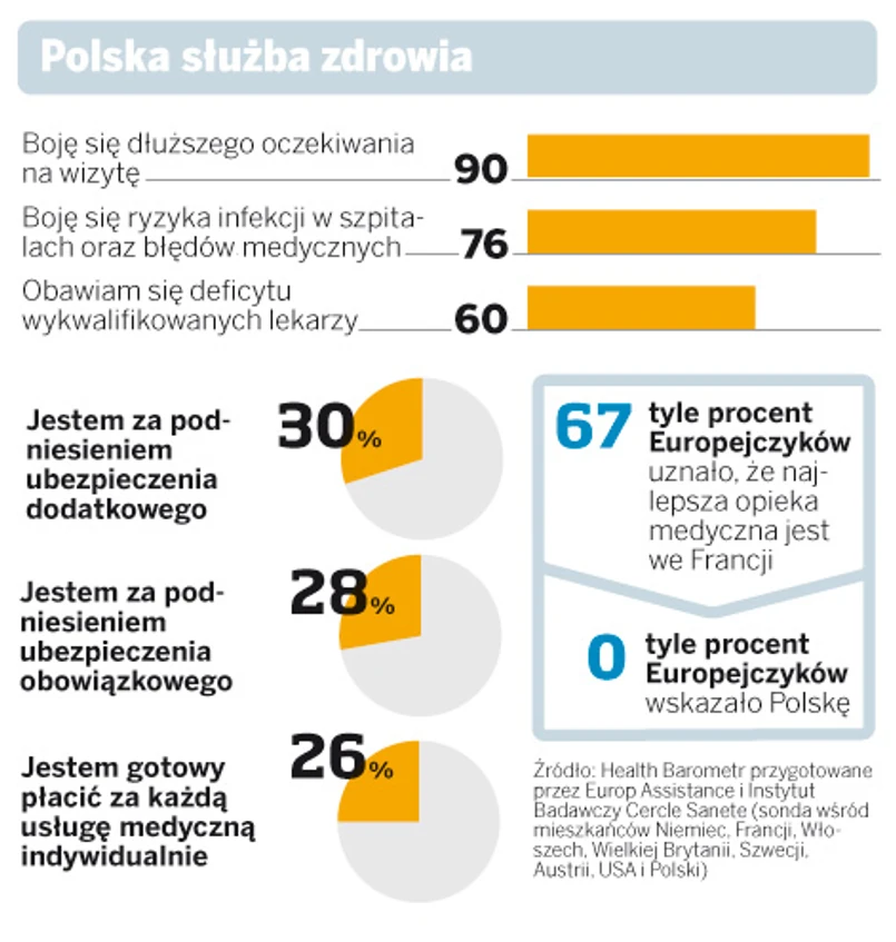 Co trzeci Polak zgodziłby się na podniesienie wysokości ubezpieczenia obowiązkowego lub dodatkowego, 26 proc. gotowych byłoby natomiast płacić za każdą usługę indywidualnie. Na razie coraz więcej Polaków leczy się samodzielnie, przez internet. Ponad połowa Polaków traktuje sieć jako cenne źródło informacji medycznych. Chorobę diagnozują, czytając internetowe fora, specjalistyczne portale.