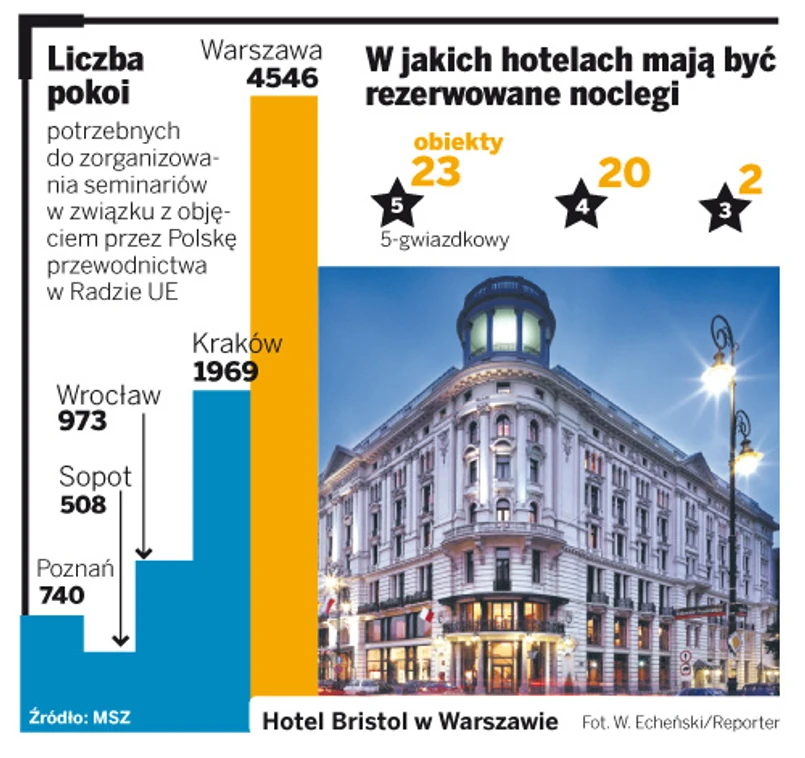 Problem w tym, że firmy te do tej pory nie otrzymały od MSZ specyfikacji warunków zamówienia i nie mogą przystąpić do rozmów z hotelarzami. A czas płynie i do naszego przewodnictwa w UE jest coraz bliżej, co stawia negocjatorów w niekorzystnej sytuacji wobec hoteli, które rezerwują miejsca dla innych klientów. I wkrótce to one będą stawiały warunki cenowe.