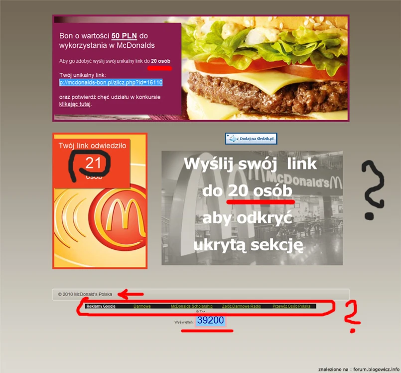 Oszustwo wykryli już na początku tego roku internauci. Na jednym z for dyskusyjnych stworzono nawet specjalny temat pod tytułem „Nie daj się nabrać na darmowe bony do MCDonald's”, gdzie użytkownicy nawzajem przestrzegali się przed grasującymi w sieci „kanapkowymi oszustami”. - Zauważyłem stronę z informacją o darmowych bonach do McDonald's za 50 zł – pisze użytkownik „Htsz”. - Ukazuje nam się strona, na której dowiadujemy się, że wystarczy wysłać wygenerowany dla nas link do 20 osób i zdobędziemy bon. Tak się jednak nie stanie – ostrzega.