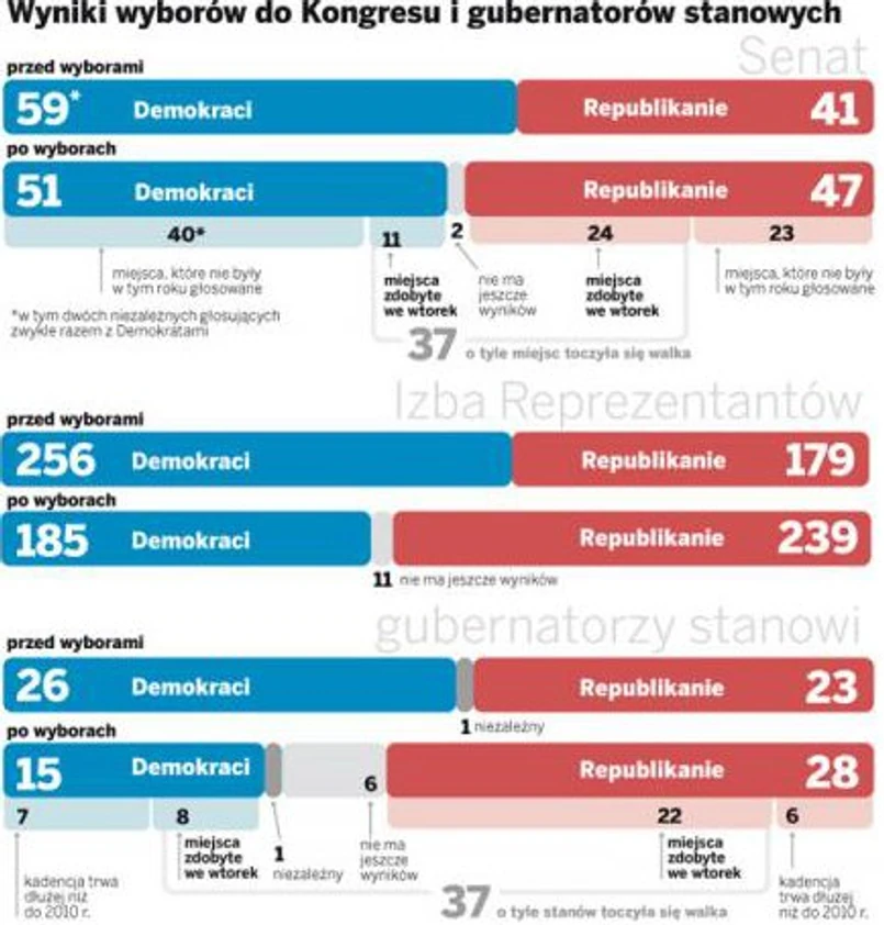 Z ogłoszonych wczoraj wyników wynikało, że Republikanie odzyskali większość w Izbie Reprezentantów, zdobywając 239 foteli wobec 184 dla Demokratów. W Senacie zdołali natomiast znacznie ograniczyć przewagę Demokratów, uzyskując 46 mandatów wobec 51 (wyniki dla 3 miejsc nie były jeszcze znane).