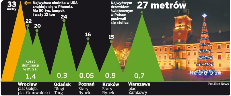 Polskie miasta prześcigają się w świątecznych ozdobach. Wydają na nie setki tysięcy złotych. Największa, aż 27-metrowa miejska choinka stanie na placu Zamkowym w Warszawie. Na sztuczne drzewko oraz udekorowanie Traktu Królewskiego stolica wyda prawie 700 tys. zł.